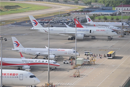 圖說:今日上午,東航接收的兩架C919客機(jī)在虹橋機(jī)場(chǎng)停機(jī)坪上,準(zhǔn)備執(zhí)行滬蓉航線。圖/張弘歷