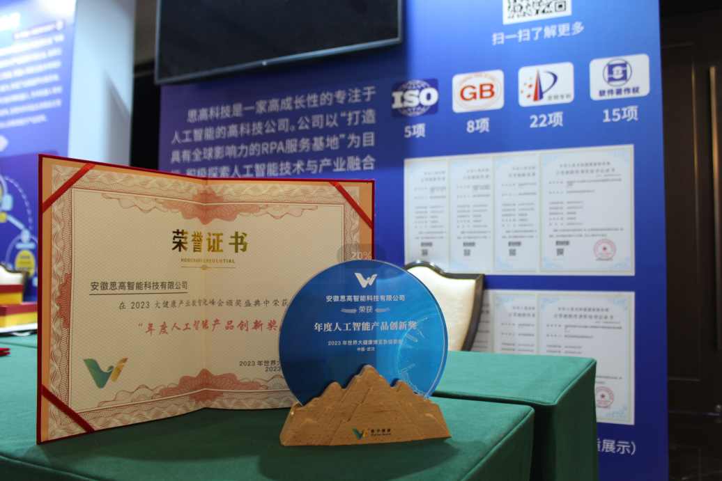 在頒獎環(huán)節(jié)中,思高科技憑借公司核心人工智能軟件產品——“RPA+AI數字員工”的產品實力和技術創(chuàng)新榮獲“年度人工智能產品創(chuàng)新獎 ”,思高科技董事長付磊憑借在助推大健康產業(yè)數字化轉型中的突出貢獻榮獲“年度大健康產業(yè)數字化創(chuàng)新人物獎”,獎項的獲得不僅是對公司人工智能技術的實力認可,也是對公司在大健康產業(yè)的持續(xù)創(chuàng)新和進步的肯定。