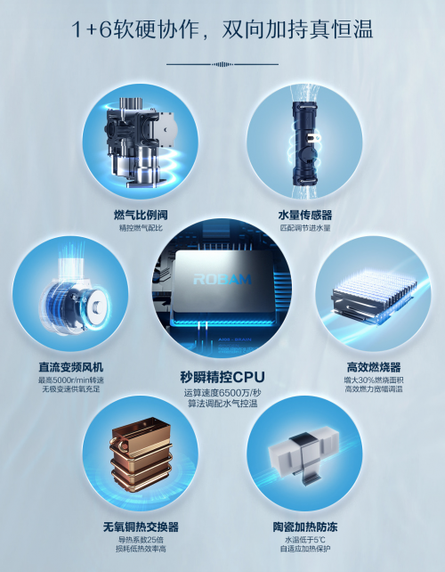 硬件上,【川】系列燃?xì)鉄崴鱄T730搭載秒瞬精控CPU,內(nèi)置全新升級(jí)的PID智能算法,可達(dá)6500萬/秒超速運(yùn)算,精準(zhǔn)計(jì)算水氣配比,使燃?xì)獗壤y和水量傳感器快速響應(yīng),迅捷精控持久恒溫。水流量傳感器,可精準(zhǔn)調(diào)節(jié)進(jìn)出口水量,在CPU的配合下實(shí)現(xiàn)水溫恒定;燃?xì)獗壤y,實(shí)時(shí)精控燃?xì)庥昧?#xff0c;高能效穩(wěn)定控溫;高效燃燒器,創(chuàng)新增氧V型火排,增大30%燃燒面積,增強(qiáng)89.68%燃燒效率,削弱15%運(yùn)行噪音,分段穩(wěn)然技術(shù)讓小火中火大火靈活調(diào)控,實(shí)現(xiàn)35-60℃寬幅調(diào)溫。直流變頻風(fēng)機(jī),最高5000r/min轉(zhuǎn)速無極變速高效供氧充足。高效無氧銅熱交換器,除了導(dǎo)熱性耐腐蝕性出色,還具備更強(qiáng)的熱沖擊性能。陶瓷加熱防凍,當(dāng)水溫低至5℃,四個(gè)陶瓷加熱器便會(huì)啟動(dòng)加熱保護(hù),無懼國(guó)內(nèi)高寒天氣,-20℃也能安心熱浴。1+6的軟硬件協(xié)作,便可讓【川】系列燃?xì)鉄崴鱄T730輸出澎湃熱水,給予你舒適的沐浴體驗(yàn)與不間斷的溫暖關(guān)懷。