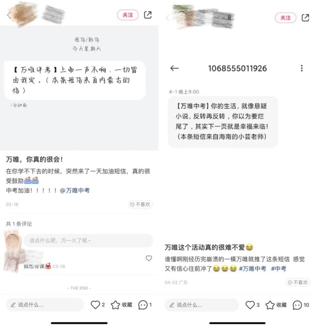 為幫助中考生做好考前心理調(diào)整,平衡心態(tài)、緩解壓力,同時給他們加油鼓勁,從考前100天開始,萬唯每周給志愿報名的學生發(fā)送加油短信,鼓勵他們堅韌、積極、自信地備考。