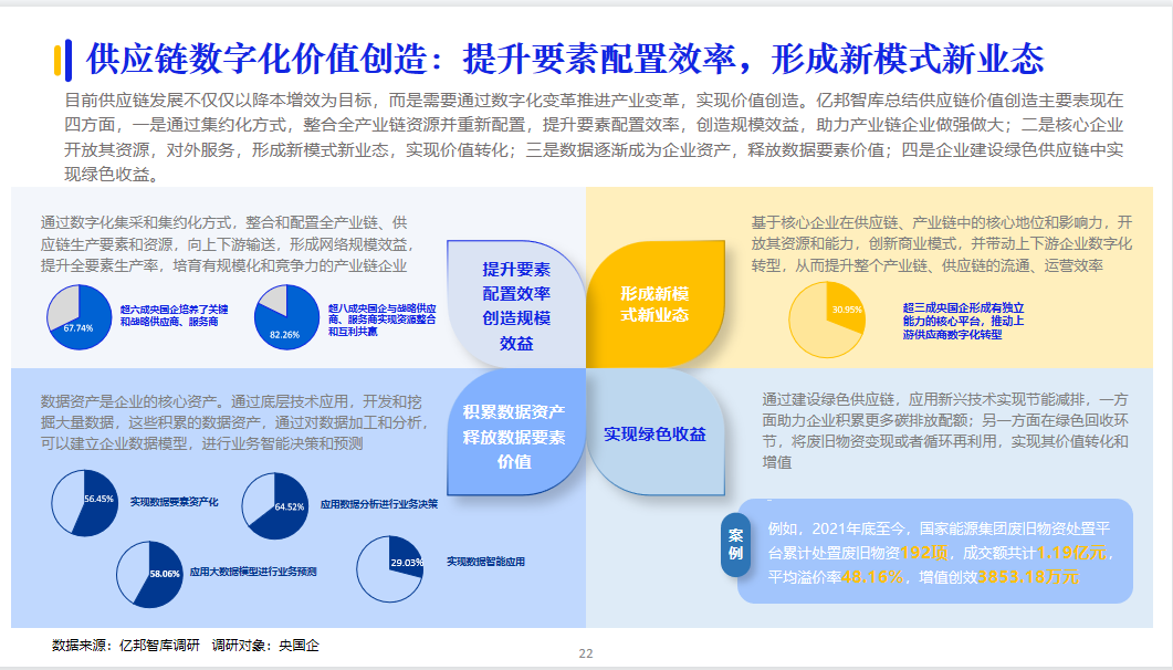 目前供應(yīng)鏈發(fā)展不僅僅以降本增效為目標(biāo),而是需要通過數(shù)字化變革推進(jìn)產(chǎn)業(yè)變革,實現(xiàn)價值創(chuàng)造。億邦智庫總結(jié)供應(yīng)鏈價值創(chuàng)造主要表現(xiàn)在四方面,一是通過集約化方式,整合全產(chǎn)業(yè)鏈資源并重新配置,提升要素配置效率,創(chuàng)造規(guī)模效益,助力產(chǎn)業(yè)鏈企業(yè)做強(qiáng)做大;二是核心企業(yè)開放其資源,對外服務(wù),形成新模式新業(yè)態(tài),實現(xiàn)價值轉(zhuǎn)化;三是數(shù)據(jù)逐漸成為企業(yè)資產(chǎn),釋放數(shù)據(jù)要素價值;四是企業(yè)建設(shè)綠色供應(yīng)鏈中實現(xiàn)綠色收益。
