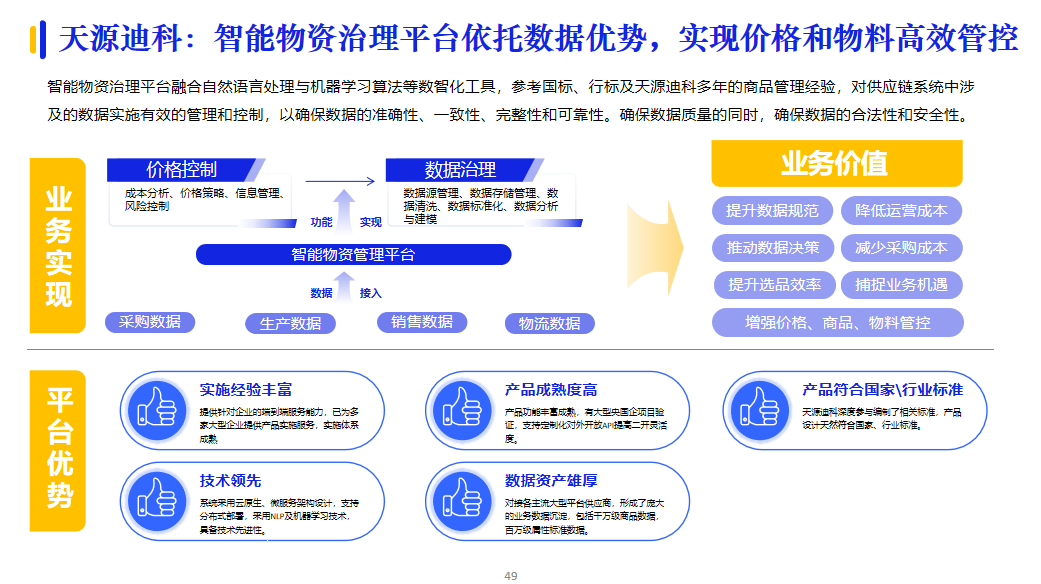 部分央國企會根據(jù)企業(yè)自身的數(shù)字化薄弱點,采取有針對性地補(bǔ)齊斷點的實施策略,包括供建立應(yīng)商協(xié)同管理系統(tǒng)、優(yōu)化物資分類與編碼設(shè)計、建立供應(yīng)商管理體系、建設(shè)電商采購平臺、設(shè)計倉儲管理體系等內(nèi)容。例如:天源迪科在智能物資治理方面,提出了價格和物料高效管控的解決方案,有效確保價格數(shù)據(jù)的合法性和安全性。
