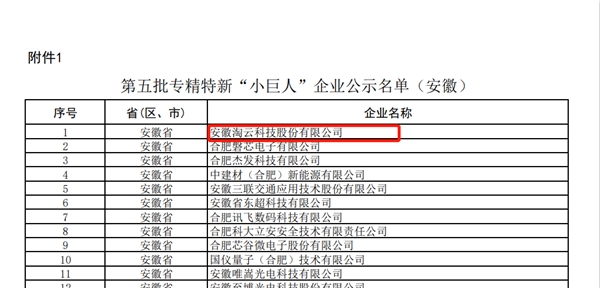 7月21日,工業(yè)和信息化部開展的第五批專精特新“小巨人”企業(yè)公示結(jié)束。安徽淘云科技股份有限公司(后稱“淘云科技”)憑借企業(yè)在專業(yè)、精細(xì)、特色、創(chuàng)新等核心競爭力領(lǐng)域的出眾表現(xiàn),從眾多參選企業(yè)中脫穎而出,成功獲得第五批國家級專精特新“小巨人”的認(rèn)定!