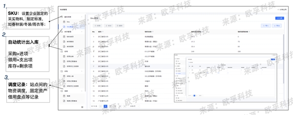 歐孚科技運用低代碼技術(shù)搭建了“物資進(jìn)-出項“管理模塊。該模塊包括搭建SKU庫,對物資物料進(jìn)行統(tǒng)一定義;配置采購調(diào)度的表單公式,使區(qū)域站點能根據(jù)實際領(lǐng)用情況進(jìn)行填寫;根據(jù)各站點領(lǐng)用數(shù)據(jù),快速統(tǒng)計物料成本并進(jìn)行庫存盤點管理。