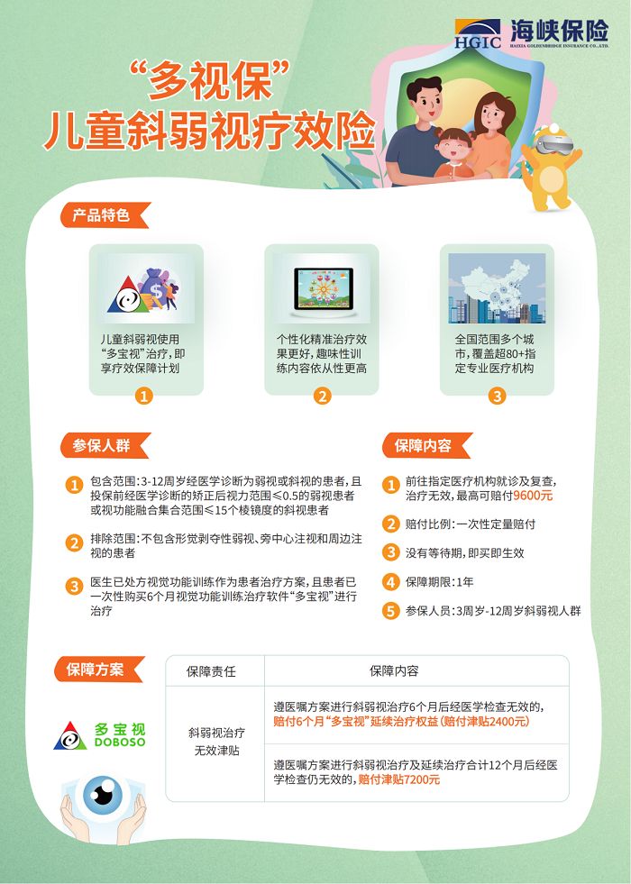 對于符合治療條件要求并一次性購買6個(gè)月“多寶視”進(jìn)行斜弱視治療的患者,即可由視景醫(yī)療為其投保“多視?!辈⑾碛袨槠谝荒甑谋U嫌?jì)劃,以確保患者能夠獲得最佳的治療效果。值得一提的是,“多視保”能覆蓋全國范圍內(nèi)的多個(gè)城市的超80+指定專業(yè)醫(yī)療機(jī)構(gòu),對于治療無效的患者最高可賠付9600元,這能大大減輕相關(guān)患者家庭的經(jīng)濟(jì)負(fù)擔(dān),讓每個(gè)斜弱視患兒家庭在治療前放心無顧慮,治療后安心有保障。