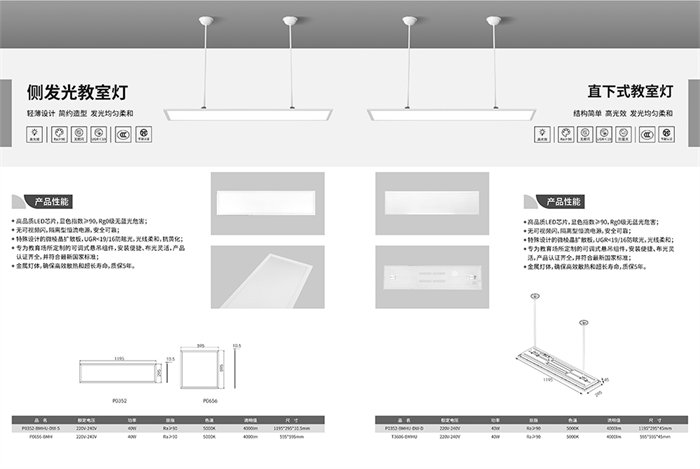 其中,LED UGR教室燈設(shè)計(jì)輕薄,造型簡(jiǎn)約,能夠讓教室煥然一新;LED直下式教室燈采用微棱鏡擴(kuò)散板,發(fā)光均勻柔和;LED格柵教室燈采用格柵面板設(shè)計(jì),光線均勻柔和;LED黑板燈采用漫反射型光柵,高光效,低能耗。