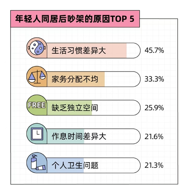 同居吵架原因TOP5中,“家務(wù)分配不均”占比為33.3%,僅次于生活習(xí)慣差異大(45.7%)。