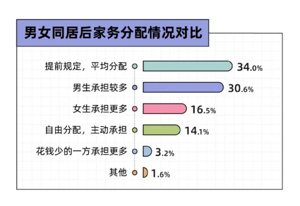 當(dāng)然,最多的情侶還是選擇“提前規(guī)定、平均分配家務(wù)”(34%),也有少量受訪者選擇讓花錢少的一方承擔(dān)更多家務(wù)??傮w而言,在家務(wù)分配上,當(dāng)代同居青年在親密關(guān)系中表現(xiàn)出平等、務(wù)實(shí)的底色。