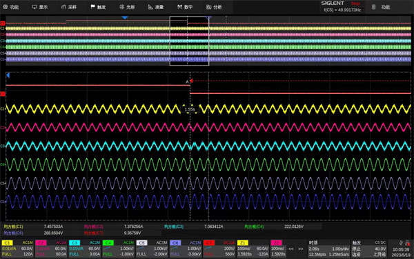 ·三相交流電分析,三相交流電廣泛應(yīng)用于需要高能效或大功率的機電設(shè)備,如三相逆變器、電機、驅(qū)動器等。逆變器廣泛應(yīng)用于家電、太陽能光伏發(fā)電、風能發(fā)電等,而在諸多汽車系統(tǒng)中,主驅(qū)、水泵、油箱冷卻系統(tǒng)都是由三相電所控制,對這些設(shè)備進行功率分析和電能質(zhì)量測量必不可少。使用SDS6000 Pro分析三相電時,其中3路接高壓差分探頭測量電壓,3路接電流探頭測量電流,這樣不僅能直接觀測到實時波形,還能利用數(shù)學運算進行各種信號處理得到電流有效值、視在功率、波峰因數(shù)、諧波失真等參數(shù)。