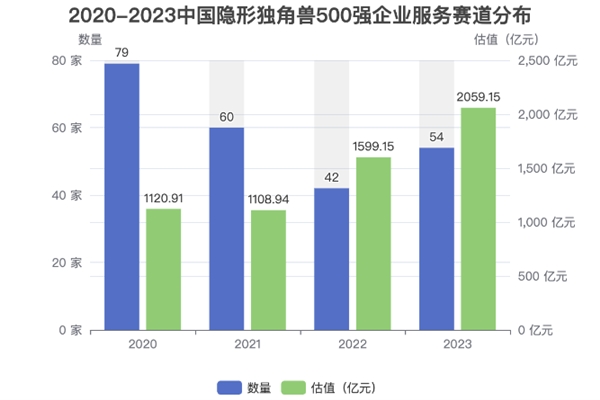 報(bào)告顯示,2023中國(guó)隱形獨(dú)角獸500強(qiáng)企業(yè)服務(wù)賽道獨(dú)角獸企業(yè)有54家,估值合計(jì)為2059.15億元(如上圖)。根據(jù)BIHU創(chuàng)業(yè)伯樂(lè)獨(dú)角獸企業(yè)數(shù)據(jù)庫(kù)(EMUDB),2021-2023中國(guó)隱形獨(dú)角獸500強(qiáng)企業(yè)服務(wù)賽道隱形獨(dú)角獸企業(yè)同比分別減少19家、減少18家、增加12家;企業(yè)服務(wù)賽道隱形獨(dú)角獸企業(yè)估值合計(jì)同比分別降低1.07%、增長(zhǎng)44.21%、增長(zhǎng)28.77%。2023年與2022年相比,企業(yè)服務(wù)賽道隱形獨(dú)角獸企業(yè)從42家上漲到54家,增加了12家,漲幅為28.57%,呈現(xiàn)出上升趨勢(shì);估值合計(jì)從1599.15億元上漲到2059.15億元,增長(zhǎng)了460億元,漲幅為28.77%,呈現(xiàn)出上升趨勢(shì)。