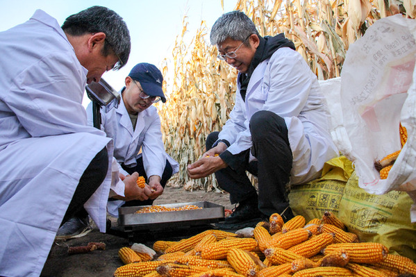 中國(guó)農(nóng)業(yè)科學(xué)院作物栽培與生理創(chuàng)新團(tuán)隊(duì)首席專家李少昆研究員(右一)在通遼市開魯縣一處千畝片示范田開展工作。記者 連振 攝