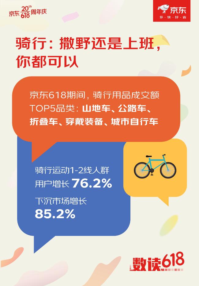 京東騎行數(shù)據(jù)顯示,騎行在今年應該可以拿下增速最高的戶外類目頭牌。其中分(專業(yè)、非專業(yè)、泛潮)公路車、山地車、青少年自行車、電助力車、城市通勤自行車等,品類十分豐富,能很好地滿足騎行達人們的“步履不?!钡目犰胚\動生活。