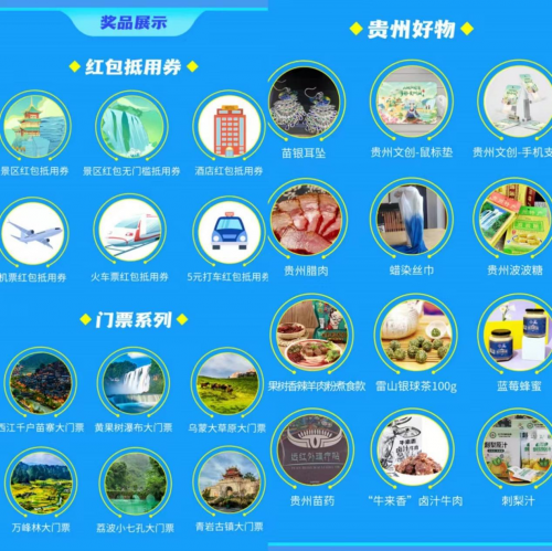 本次盲盒活動(dòng)獎(jiǎng)品重點(diǎn)突出貴州省內(nèi)景點(diǎn)、文創(chuàng)產(chǎn)品、特色美食。從貴州重點(diǎn)景區(qū)如西江千戶苗寨、黃果樹瀑布、烏蒙大草原、荔波小七孔的大門票,到苗銀耳墜、貴州臘肉、蠟染絲巾、貴州波波糖、貴州苗藥等貴州好物,好玩、好吃、好用一應(yīng)俱全。此外,盲盒還提供景區(qū)、酒店、機(jī)票、火車票、打車紅包抵用券,誠意滿滿。
