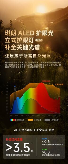 為此,琪朗以“為人類創(chuàng)造舒適的健康光環(huán)境”為使命,致力打造中國千萬兒童房專用護眼光環(huán)境。2022年,琪朗聯合中山大學中山眼科中心共同研發(fā)全新專利技術ALED護眼光。新一代ALED護眼光其原理是打造與太陽光的可見光譜接近的照明光譜,通過降低有害藍光峰值,補全孩子眼睛發(fā)育關鍵的紅光波段,緩解孩子近距離用眼疲勞,延緩近視發(fā)生發(fā)展。自從愛迪生發(fā)明光源以來,經歷了白熾燈、鹵素燈、熒光燈、LED燈后,ALED護眼光是人類史上最近接太陽光譜的光源,其光源更護眼,更舒適,更健康。
