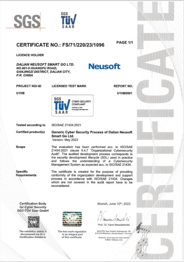 從產(chǎn)品開發(fā)到組織管理,東軟將汽車電子與網(wǎng)絡(luò)安全高度融合,形成一整套汽車網(wǎng)絡(luò)安全管理流程,覆蓋智能網(wǎng)聯(lián)汽車安全的整個生命周期,踐行對客戶持續(xù)全面保障網(wǎng)絡(luò)安全服務(wù)的鄭重承諾,也由此順利完成管理體系認(rèn)證的全部內(nèi)容并獲得了認(rèn)證證書,得到了SGS的高度稱贊。
