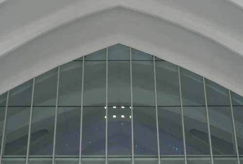 登錄廳“鳥喙”造型凈高34m,頂端懸挑長度達到6m。梁柱縱橫交錯、網(wǎng)狀交織。八局裝飾采用裝配式設計施工方法,現(xiàn)場組裝、單元吊裝、多條安裝線流水施工,完成1400塊雙曲異形超長鋁板快速安裝,輔以9953盞Dmax-512系統(tǒng)RGBW調(diào)光燈,營造流光溢彩的視覺效果,讓建筑空間更具藝術特性。