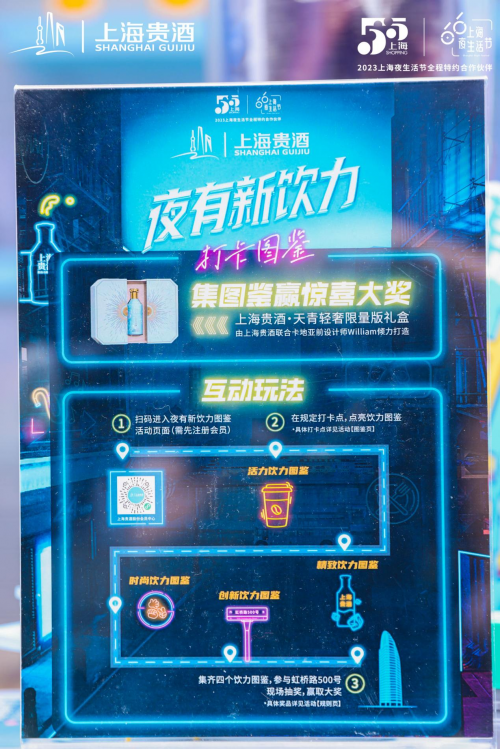 “2023上海夜生活節(jié)”正如火如荼地進(jìn)行,上海貴酒營(yíng)造創(chuàng)新消費(fèi)體驗(yàn),撬動(dòng)消費(fèi)活力,打造了貫穿整個(gè)6月“夜有新飲力”主題活動(dòng),攜手滬上高端餐飲及深受年輕消費(fèi)者青睞的網(wǎng)紅餐廳發(fā)起全城總動(dòng)員,創(chuàng)造“餐+酒+娛”場(chǎng)景融合新模式 ,形成線上線下互動(dòng)營(yíng)銷(xiāo)、休閑娛樂(lè)于一體的創(chuàng)新消費(fèi)場(chǎng)景,助力上海點(diǎn)亮城市夜經(jīng)濟(jì)。