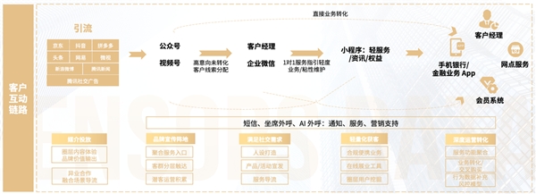 金融企業(yè)在客戶全鏈路互動與經(jīng)營上,涉及到的渠道觸點(diǎn)也比較多。通常,在引流階段,客戶通過交易型 App、資訊類 App、種草媒體等進(jìn)行互動,之后進(jìn)入公眾號、視頻號為主的公私域轉(zhuǎn)換的形態(tài),如果轉(zhuǎn)化周期較長,還會通過客戶經(jīng)理和企業(yè)微信進(jìn)行 1V1 服務(wù)引導(dǎo)和關(guān)系維護(hù),還可以直接導(dǎo)量到小程序或 H5 進(jìn)行輕轉(zhuǎn)化,以及到手機(jī)銀行、金融業(yè)務(wù) App,結(jié)合客戶經(jīng)理、網(wǎng)點(diǎn)服務(wù)和會員系統(tǒng)加強(qiáng)后鏈路深度運(yùn)營。