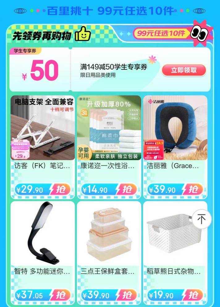 為了讓學(xué)生們省錢煥新,京東開學(xué)季特設(shè)“百里挑十 ”專區(qū),雜物收納籃、筆記本電腦支架、泡腳盆、毛巾、水果刀、除螨噴霧等剛需好物99元任選10件,更有搬家打包收納袋、真空壓縮包、抽屜式桌面收納盒、衣服收納筐等海量商品享低至5折的學(xué)生折扣,為學(xué)生們帶來(lái)超值優(yōu)惠。