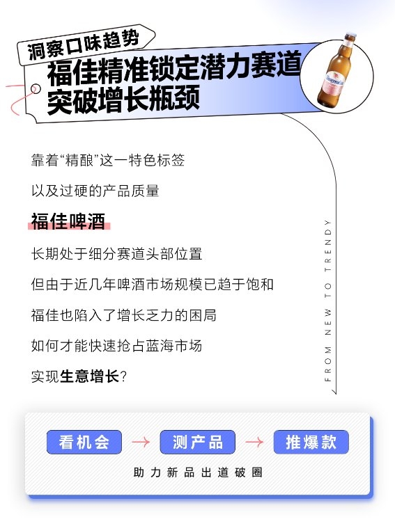 福佳啤酒在巨量云圖“新品推爆”全能力的加持下,通過商品多維度洞察快速了解市場(chǎng)趨勢(shì),并利用「新品實(shí)驗(yàn)室」進(jìn)行敏捷、準(zhǔn)確地測(cè)品,有效降低上新試錯(cuò)成本,精準(zhǔn)定位潛力貨品、高價(jià)值人群以及營(yíng)銷場(chǎng)景,在實(shí)現(xiàn)短期生意增量爆發(fā)的同時(shí),也為品牌在抖音平臺(tái)長(zhǎng)效經(jīng)營(yíng)累積了人群資產(chǎn)。