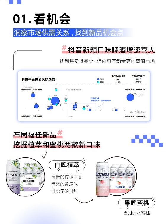 基于巨量云圖商品洞察能力,福佳對(duì)抖音啤酒大盤現(xiàn)狀及細(xì)分賽道趨勢(shì)進(jìn)行分析,發(fā)現(xiàn)抖音啤酒細(xì)分類目均正增長(zhǎng),其中白啤增長(zhǎng)最可觀,果啤趨向高客單商品。進(jìn)一步洞察抖音啤酒風(fēng)味趨勢(shì)發(fā)現(xiàn),新穎口味啤酒增速喜人,黃瓜和桃子兩種口味受抖音消費(fèi)者關(guān)注,但市場(chǎng)的針對(duì)性供給較少,蘊(yùn)含巨大的發(fā)展?jié)摿?這恰巧與福佳現(xiàn)有產(chǎn)品組合高度匹配。