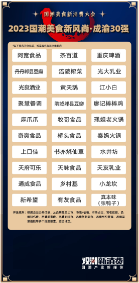 國(guó)潮品牌之夜是一場(chǎng)專屬中國(guó)美食品牌的加冕之夜。在借由盛典彰顯國(guó)潮美食風(fēng)尚之余,觀潮新消費(fèi)還發(fā)布了《2023國(guó)潮美食新風(fēng)尚·成渝30強(qiáng)》,旨在打造成渝核心企業(yè)標(biāo)桿,描繪區(qū)域食品工業(yè)發(fā)展藍(lán)圖,為進(jìn)一步推動(dòng)企業(yè)創(chuàng)新、深化產(chǎn)業(yè)合作、實(shí)現(xiàn)成渝經(jīng)濟(jì)高質(zhì)量發(fā)展提供參考。