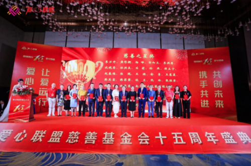 下午,愛心聯(lián)盟慈善基金會成立十五周年盛典隆重舉行。全國勞動模范、全國五一勞動獎?wù)芦@得者、全國道德模范、吉林省工商聯(lián)副主席、吉林省河南商會會長、愛心聯(lián)盟慈善基金會理事長李萬升,河南省政府駐上海辦副主任胡華杰,哈爾濱市政府駐上海辦經(jīng)協(xié)處處長田磊,中國浦東干部學(xué)院黨建研究中心主任吳濤,上海中信國旅總經(jīng)理羅良剛,山東馳恒投資發(fā)展有限公司董事長王久紅,昆山物流協(xié)會會長孫喜,來伊份股份有限公司高級副總裁趙漢利,新希望集團(tuán)草根資本投資部部長許云龍,上海歐邦醫(yī)療管理有限公司創(chuàng)始人崔海茹,眼界(上海)健康管理有限公司創(chuàng)始人謝攖寧,浙江省有機(jī)產(chǎn)業(yè)協(xié)會理事長胡珊,上海妃魚股份高級副總裁李財鋒,愛心聯(lián)盟慈善基金會執(zhí)行理事長楊崢,以及上海市工商聯(lián)直屬商會和各省市在滬異地商會秘書長等來自全國各地的精英和愛心聯(lián)盟成員300余人歡聚一堂,共同慶祝愛心聯(lián)盟慈善基金會成立十五周年。