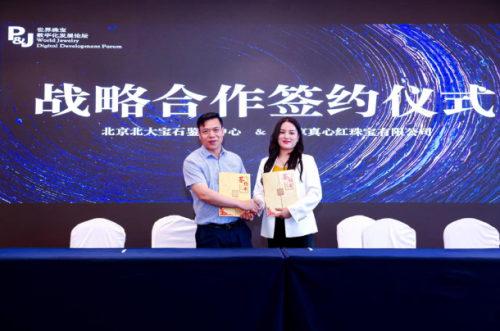 活動(dòng)現(xiàn)場(chǎng),北京北大寶石鑒定中心與北京真心紅珠寶有限公司還舉辦了現(xiàn)場(chǎng)簽約儀式,雙方將在珠寶鑒定、數(shù)字化溯源以及從業(yè)人員專業(yè)培訓(xùn)等多個(gè)版塊開展豐富的合作。