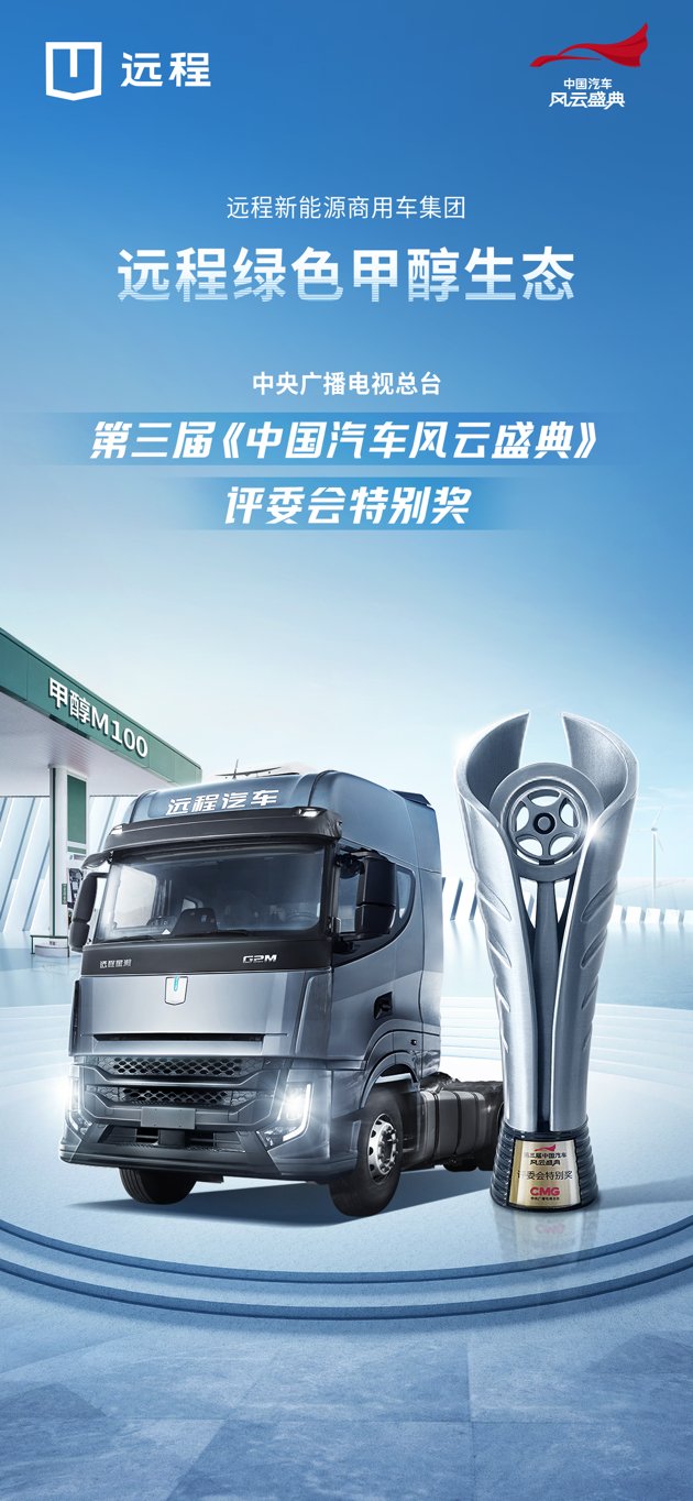 2023年4月7日,在中央廣播電視總臺(tái)主辦的第三屆《中國汽車風(fēng)云盛典》頒獎(jiǎng)典禮上,遠(yuǎn)程綠色甲醇生態(tài)榮獲評委會(huì)特別獎(jiǎng),成為首個(gè)以商用車為主體的獲獎(jiǎng)企業(yè)。