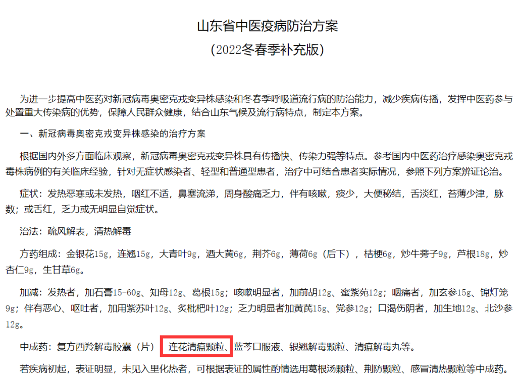 連花清瘟從2003年進(jìn)入市場(chǎng)至今,已經(jīng)獲得國(guó)家層面20余次方案推薦,從甲型流感、乙型流感、禽流感到新型冠狀病毒性肺炎,在這十幾年我國(guó)發(fā)生的病毒傳染性重大公共衛(wèi)生事件中,連花清瘟都獲得了治療方案的推薦,成為治感冒、防流感、治療新冠肺炎代表性中成藥。2022年1月《山東省中醫(yī)疫病防治方案(2022冬春季補(bǔ)充版)》中將“連花清瘟顆?!绷袨樾鹿诓《緤W密克戎變異株感染的治療方案推薦中成藥。