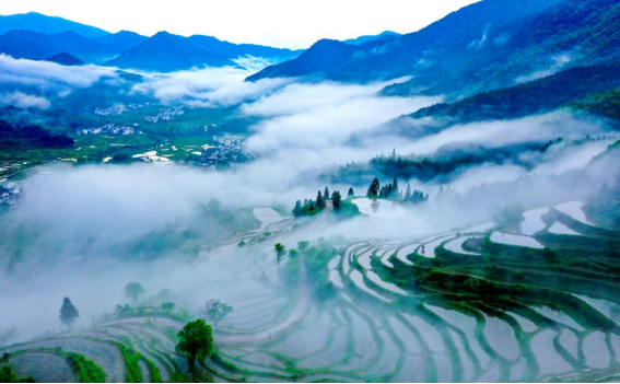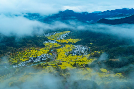 清風吹拂金波涌,飄溢醉人濃郁香,在“中國四大花?!敝坏慕瓗X梯田,漫山遍野的油菜花隨著梯田彎曲的線條蜿蜒至遠方,猶如金蛇舞動。煙雨中的江嶺,空氣中飄散著清新的泥土氣息和油菜花的清香,置身江嶺梯田,遠遠望著民居與花海仿若仙,朦朧夢幻?!@正是在婺源江嶺這幅水墨江南畫里,讓我們無比渴求的,仿佛從畫中來,帶著水墨香。