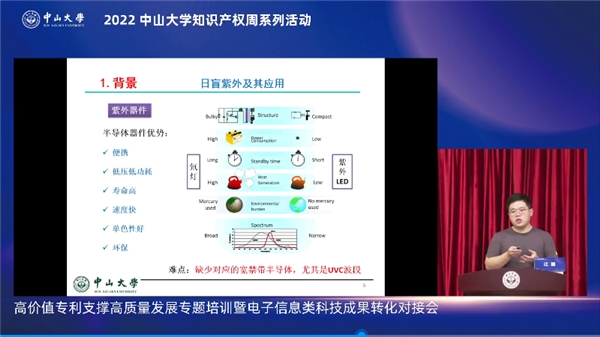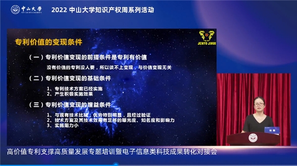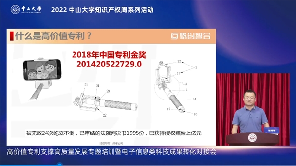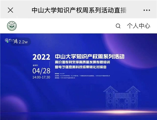 2022年4月28日,在中山大學(xué)的全程指導(dǎo)及越秀區(qū)政府的鼎力支持下,中山大學(xué)科學(xué)研究院、廣州高新區(qū)黃花崗科技園管委會、中山大學(xué)圖書館、廣州中大知識產(chǎn)權(quán)服務(wù)有限公司共同成功主辦中山大學(xué)知識產(chǎn)權(quán)周系列活動高價(jià)值專利支撐高質(zhì)量發(fā)展專題培訓(xùn)暨電子信息類科技成果轉(zhuǎn)化對接會。本次活動采取線上方式開展,邀請兩位業(yè)界專家圍繞高價(jià)值專利支撐高質(zhì)量發(fā)展做專題報(bào)告,多達(dá)178項(xiàng)電子信息類專利項(xiàng)目與83家企業(yè)進(jìn)行了精準(zhǔn)對接,活動在線人數(shù)超2.2萬人,多位知識產(chǎn)權(quán)專家及知名企業(yè)在云端匯聚,助力知識產(chǎn)權(quán)高質(zhì)量發(fā)展。