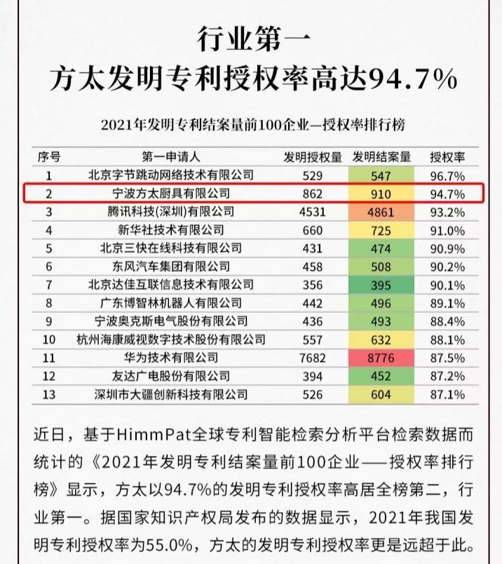 近日,基于HimmPat全球?qū)@悄軝z索分析平臺檢索數(shù)據(jù)而統(tǒng)計(jì)的《2021年發(fā)明專利結(jié)案量前100企業(yè)——授權(quán)率排行榜》顯示,廚電龍頭企業(yè)方太以94.7%的發(fā)明專利授權(quán)率高居全榜第二,行業(yè)第一。據(jù)國家知識產(chǎn)權(quán)局發(fā)布的數(shù)據(jù)顯示,2021年我國發(fā)明專利授權(quán)率為55.0%,方太的專利授權(quán)率遙遙領(lǐng)先。