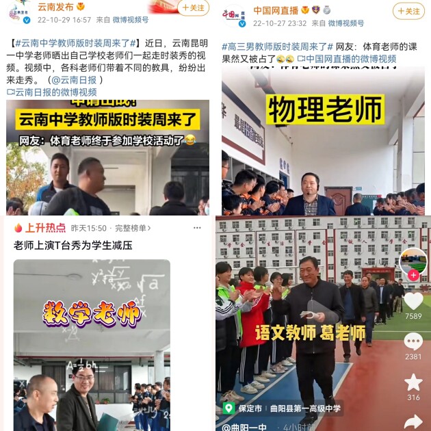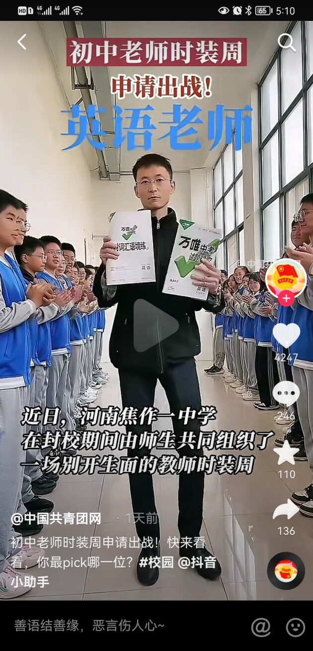 記者還注意到,“老師時裝秀”的相關視頻覆蓋面非常廣泛,在吉林、河北、河南、陜西、安徽、云南等多地校園均有出現(xiàn),其中一段河南焦作的“走秀”短視頻更是得到了中國共青團網(wǎng)抖音賬號的轉(zhuǎn)發(fā)。據(jù)悉,該視頻來源于焦作的一所初中,語文、數(shù)學、英語、物理等各科老師幾乎都參與了“走秀”,學生們在一旁喝彩鼓掌,每個人臉上都洋溢著歡樂的笑容。