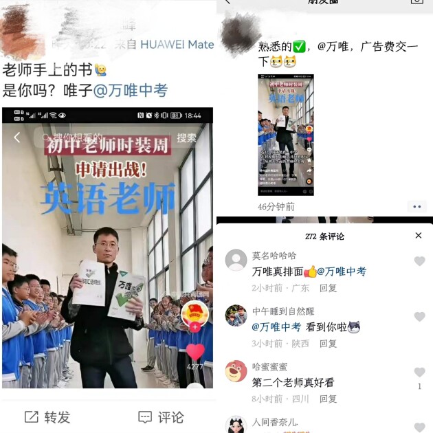 “王老師穿西服好帥啊”“吳老師真像標準的模特”“期待下一場老師T臺秀”……記者發(fā)現(xiàn),該視頻得到了大量點贊轉(zhuǎn)發(fā),幾乎每一位老師都收獲了大量評論和“粉絲”,尤其一位舉著英語資料的男教師,令許多網(wǎng)友驚呼仿佛又要考試了。原來,除了男老師“冷酷”的表情使大家聯(lián)想到自己曾經(jīng)嚴肅的老師外,還因為他手里舉著一本《萬唯中考試題研究》。據(jù)了解,《萬唯中考試題研究》在全國30個省(區(qū)市)的初中校園中廣泛使用,因此當它出現(xiàn)時,不少網(wǎng)友直呼“熟悉”“青春回來了”。