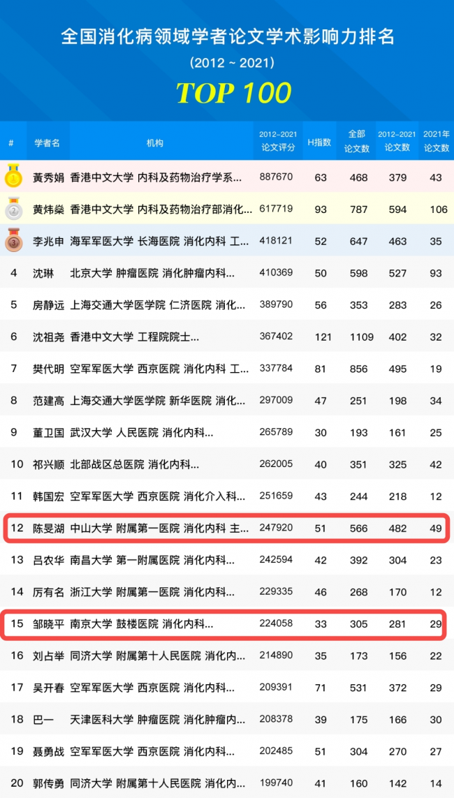 在今年全球?qū)W者庫發(fā)布的《2012-2021年全國消化病領(lǐng)域?qū)W者論文學術(shù)影響力排名》中,泰康醫(yī)療旗下深圳前海泰康國際醫(yī)院(籌)高級顧問陳旻湖教授與泰康仙林鼓樓醫(yī)院院長鄒曉平教授雙雙入選TOP100。其中,陳旻湖教授以H指數(shù)(在一定期間內(nèi)發(fā)表的論文至少有h篇的被引頻次不低于h次)51、全部論文數(shù)566篇,位列全國總排名第12位;鄒曉平教授則以H指數(shù)33、全部論文數(shù)305篇,位列全國總排名第15位。