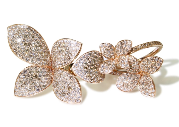 品牌標(biāo)志性的Giardini Segreti系列,汲取置身米蘭神秘的花園和庭院的靈感,鑲嵌大量白鉆或香檳鉆點綴,流動舒展,好似葉片在風(fēng)中如花朵紛飛,如蝴蝶般振翅舞動的蛻變之旅。