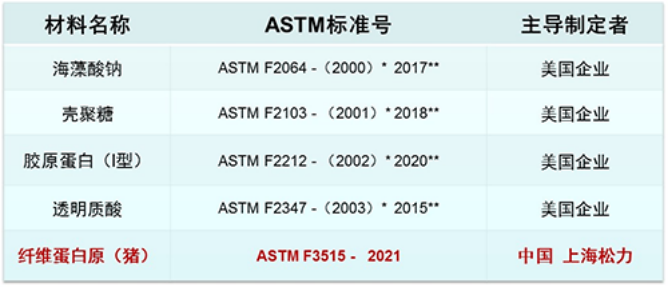 ASTM International自2000年以來,共批準(zhǔn)發(fā)布了5個(gè)天然高分子材料的ASTM標(biāo)準(zhǔn),前4個(gè)均形成了龐大的產(chǎn)業(yè),且均為美國(guó)企業(yè)主導(dǎo)制訂。第5個(gè)為中國(guó)生物科技領(lǐng)軍企業(yè)-上海松力主導(dǎo)制訂