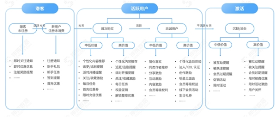 沉默&流失期,需要對高流失風險客戶深度洞察,進行流失用戶召回。一般可以用熱門內(nèi)容Push進行站內(nèi)/站外召回。因為用戶流失是一個過程,不是一個節(jié)點,用戶流失之后再召回很難100%召回,所以要在用戶流失前,進行有效觸達,防止或者延緩用戶流失,并且召回要有周期性,進行多次召回無果的用戶可自動標記為無價值/流失用戶。