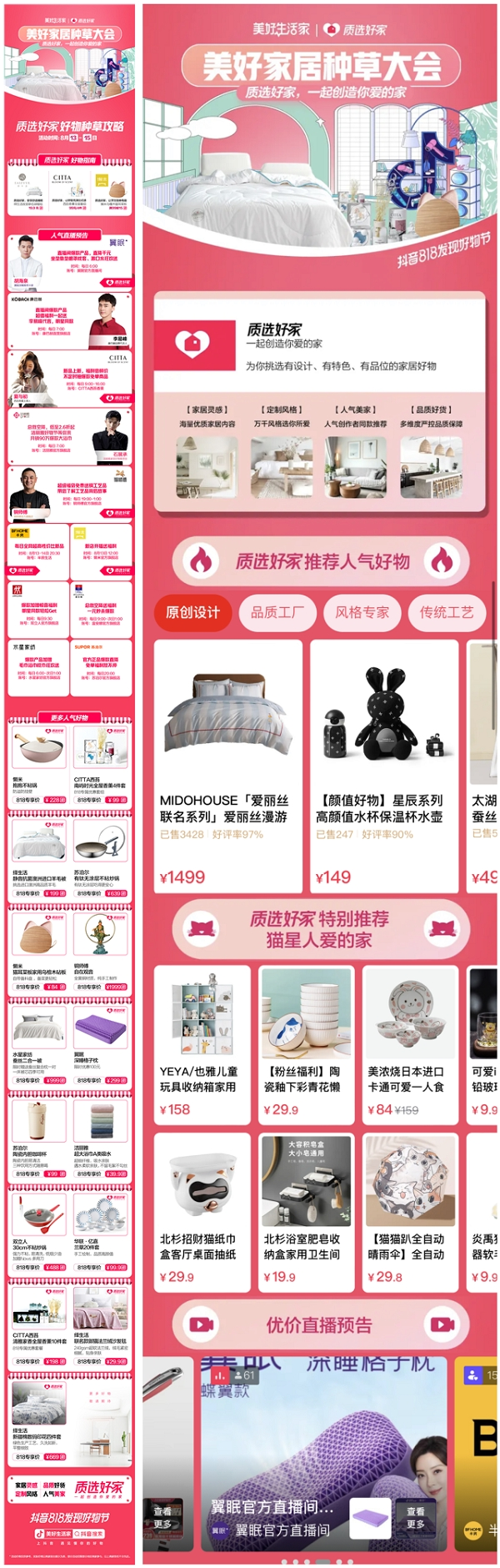 抖音電商作為線上優(yōu)質(zhì)消費(fèi)品種草場(chǎng)景,在擁躉了一大批消費(fèi)者之后,精準(zhǔn)洞察各類型消費(fèi)群體的生活狀態(tài)與對(duì)家居采購(gòu)的深層需求成為了當(dāng)下重要的課題,從理解用戶痛點(diǎn)、人氣種草、口碑推薦到美好生活場(chǎng)景的情緒向共鳴,「質(zhì)選好家」通過內(nèi)容、商品多重撮合方式吸引多類型人群參與其中,引爆流量熱潮,助力更好的商品熱賣,高效的撮合了人與商品之間的供需關(guān)系,真正促成了「雙向奔赴」的美好體驗(yàn)不斷發(fā)生。