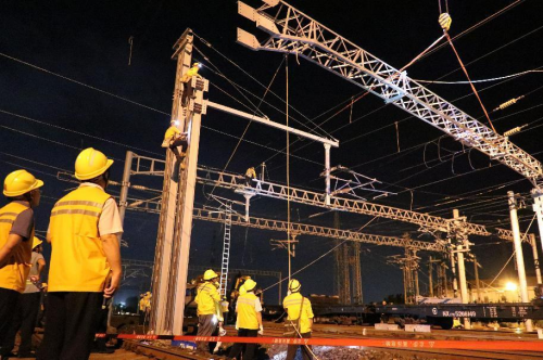 ??谡臼沁B接環(huán)島高鐵東西段、西環(huán)貨線和過海列車的樞紐車站,日常維修天窗時(shí)間只有60-120分鐘,施工天窗也在180分鐘內(nèi),對于更換跨越7條承導(dǎo)線索的硬橫梁是個(gè)不小的挑戰(zhàn),該段周密部署,從9月15日就進(jìn)入了緊張的更換??谡居矙M梁的過渡施工天窗作業(yè)中。