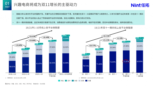 回顧2018年-2021年雙11全域電商增長趨勢可見,2018年-2021年全域電商雙11銷售增長逐步放緩,2021年,不含抖音銷售規(guī)模,僅維持個位數(shù)增長。