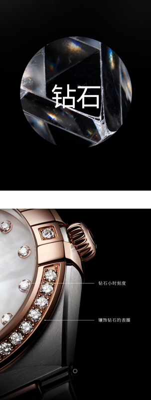 鉆石源自天地自然,晶瑩華美。歐米茄只甄選凈度從無瑕到VVS級別的“Top Wesselton”白色鉆石,經(jīng)高水準(zhǔn)的專業(yè)切割工藝和精妙設(shè)計(jì),或鑲于表圈,或嵌在表盤,以璀璨光芒詮釋永恒之美。