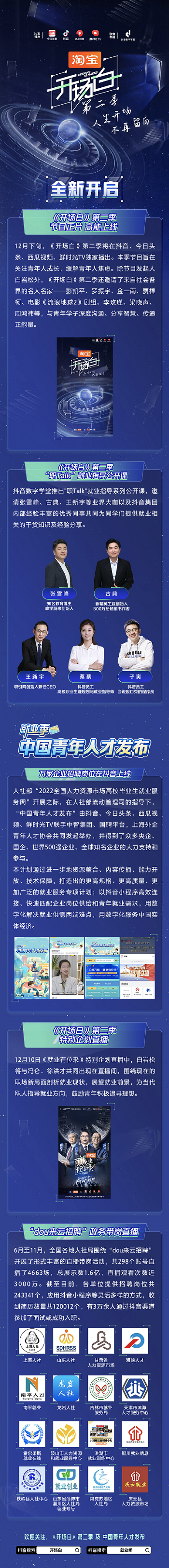 另一方面,面對(duì)首批00后畢業(yè)生加入求職大軍,第二季《開場(chǎng)白》特別企劃直播專場(chǎng)“就業(yè)有位來”,也計(jì)劃于12月10日上線。這檔直播專場(chǎng)特邀白巖松、馮侖、徐洪才等名人學(xué)者擔(dān)任嘉賓,由原《我是演說家》全國(guó)總冠軍、清華大學(xué)梁植博士主持,聚焦“人才”和“就業(yè)優(yōu)先”等當(dāng)代焦點(diǎn)議題,圍繞時(shí)下職場(chǎng)新局面以及藍(lán)領(lǐng)行業(yè)的新生態(tài)展開探討,展望未來就業(yè)前景,主張“就業(yè)有位來”。這檔直播專場(chǎng)也是在2022年全國(guó)人力資源市場(chǎng)高校畢業(yè)生就業(yè)服務(wù)周的號(hào)召背景下,在國(guó)家人社部流動(dòng)管理司的支持指導(dǎo)下,由抖音、今日頭條、西瓜視頻、鮮時(shí)光TV攜手中智集團(tuán)、上海外企青年人才協(xié)會(huì)共同發(fā)起,也得到眾多央企、國(guó)企、世界500強(qiáng)企業(yè)、全球知名企業(yè)共襄盛舉。