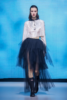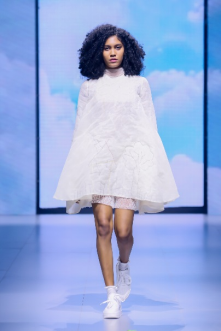 在“童年”主題秀演中,法國設(shè)計師聯(lián)袂浙江懿紗紡織科技有限公司、紹興柯橋豐旺紡織品有限公司,圍繞兒童的藝術(shù)、回到學校、童年的回憶三個子主題,共同演繹了童年的懷舊故事。設(shè)計師以精細的絎縫、印染、明線縫紉及自然著色的效果制作服裝和圖案,在工藝上采用了法國特有的編織技術(shù),并結(jié)合WALTZ系列花紗、三醋酸、錦滌歐根紗、六角硬網(wǎng)等面料輕薄有型、色彩飽滿的特色,最大程度實現(xiàn)了紡織工藝的價值化。特別是在傳統(tǒng)手工藝非遺、生態(tài)環(huán)保材料等系列元素的加持下,為整場秀演增添了可持續(xù)時尚的價值。