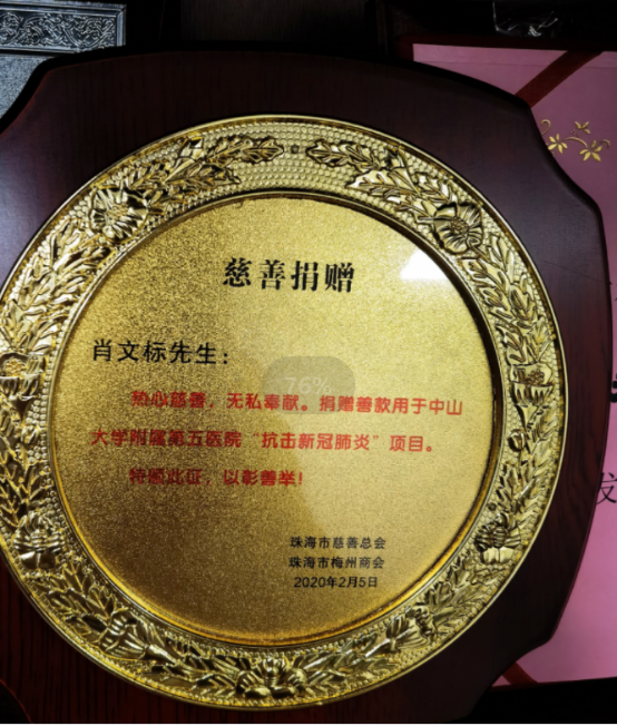 ▲珠海市慈善總會、珠海市梅州商會授予肖文標的獎牌