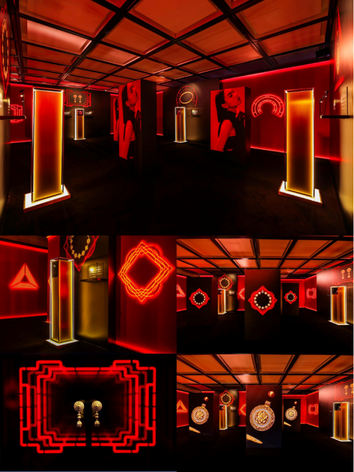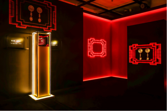 博大精深的中國傳統(tǒng)文化孕育出無限創(chuàng)造力和想象力,因此周大福珠寶集團(tuán)在探索珠寶美學(xué)與中國傳統(tǒng)文化相結(jié)合的過程中不斷推陳出新,呈獻(xiàn)許多匠心獨(dú)運(yùn)的藝術(shù)臻品——標(biāo)志性的周大福傳承系列作品。此次GOLD IS CHIC鎏光時(shí)代·周大福傳承系列黃金美學(xué)藝術(shù)展跨越時(shí)空界限,將蘊(yùn)含歷史、文化的黃金美學(xué)呈現(xiàn)到大眾視野中,全方面展現(xiàn)黃金珠寶設(shè)計(jì)背后的時(shí)尚創(chuàng)意靈感、精益求精的工藝和具有東方韻味的藝術(shù)美學(xué)理念。此次展覽的空間設(shè)計(jì)從周大福傳承系列視覺大片中汲取靈感,衍生出紅黑金三色、光影不斷變換、又極富想象力的三個(gè)空間,以創(chuàng)新的藝術(shù)視角展現(xiàn)品牌具有中國傳統(tǒng)文化內(nèi)涵的時(shí)尚潮流形象。置身于展覽空間,映入眼簾的是霓虹線條與迷離燈光相互交織而成的“時(shí)光隧道”,使人仿佛置身于過去與未來的交界地。光影流動(dòng)的變幻間,映照出品牌歷經(jīng)歲月沉淀后的璀璨輝煌,這意味著品牌正開啟黃金世代的嶄新篇章。
