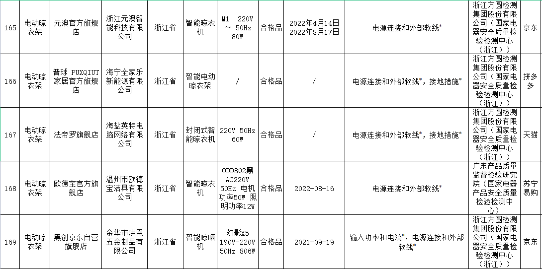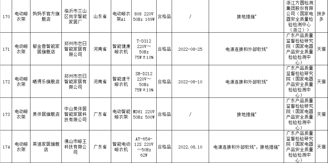 無獨(dú)有偶,據(jù)上海市市場監(jiān)督管理局發(fā)布的2022年上海市產(chǎn)品質(zhì)量監(jiān)督抽查結(jié)果(第十批)顯示,11批次智能晾衣架抽查不合格,其中涉及HOTATA好太太、美時(shí)美克EMOED、南極人等品牌。