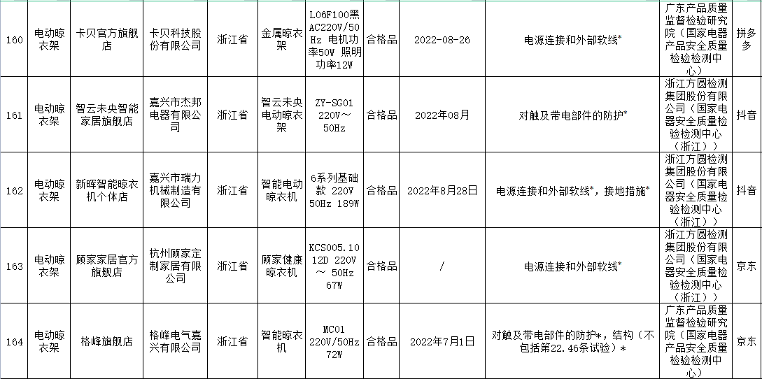 本次電動(dòng)晾衣架抽查檢驗(yàn)9個(gè)省(市)48家企業(yè)生產(chǎn)的52批次產(chǎn)品,包括天貓、京東、拼多多、抖音等電子商務(wù)平臺,發(fā)現(xiàn)24批次產(chǎn)品不合格,涉及卡瑞琪(courage)、顧家、格峰、盼盼、歐蘭特等品牌。