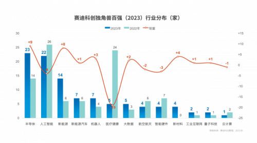賽迪科創(chuàng)獨(dú)角獸百?gòu)?qiáng)(2023)在新材料行業(yè)實(shí)現(xiàn)新突破,受益于我國(guó)新能源汽車(chē)市場(chǎng)爆發(fā),帶動(dòng)上游鋰電池正極材料、電解液、隔膜等需求加速釋放,有3家新材料行業(yè)企業(yè)首次入圍獨(dú)角獸百?gòu)?qiáng),分別是融通高科、福建德?tīng)?、先?dǎo)薄膜;同時(shí),獨(dú)角獸百?gòu)?qiáng)前10名中新能源及新能源汽車(chē)行業(yè)獨(dú)占5席,排名均在前六名。從數(shù)量分布看,半導(dǎo)體、人工智能、新能源行業(yè)分布數(shù)量位列前三,上榜企業(yè)數(shù)量分別達(dá)到23家、22家、14家,其中,半導(dǎo)體與新能源行業(yè)上榜企業(yè)數(shù)量增長(zhǎng)最多,分別增加9家和8家,成為最熱門(mén)賽道。
